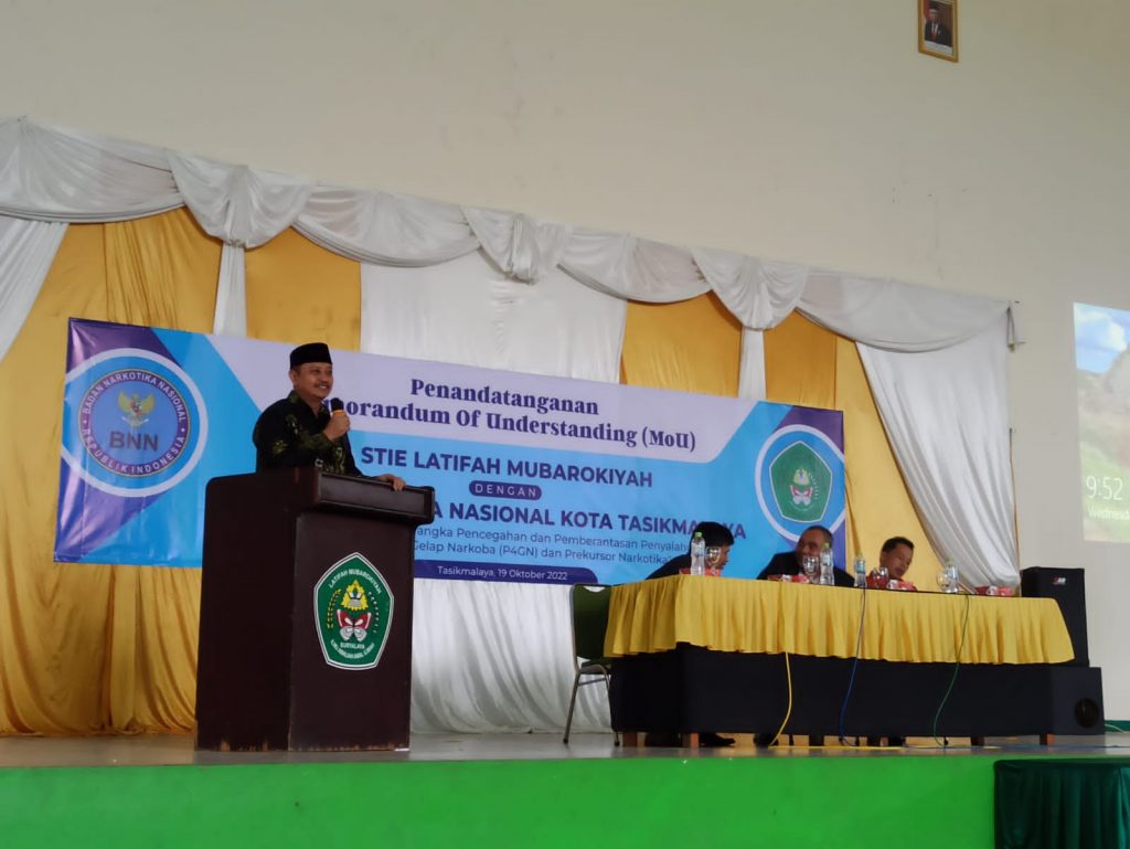 Dalam sambutannya Ketua STIE Latifah Mubarokiyah menyatakan bahwa kegiatan ini sangat strategis dalam memberikan pemahaman kepada mahasiswa serta mendorong mahasiswa untuk berperan aktif dalam menyadarkan masyarakat akan bahaya narkotika, di mulai dari lingkungan yang paling kecil yaitu di keluarga, saudara, tetangga, RT, RW dan desa. Dan apabila semua bergerak secara kolektif maka itu akan menjadi pertahanan dan kekuatan bangsa ini, karena hari ini ancaman yang sangat berbahaya salah satunya adalah narkoba sehingga narkoba dikatakan sebagai kejahatan luar biasa (extraordinary crime) dan hukumannya sangat berat. Dan ini menjadi momentum sangat strategis bagi STIE Latifah Mubarokiyah dan BNN Kota Tasikmalaya guna mewujudkan Kabupaten Tasikmalaya khususnya umumnya Tasikmalaya bebas narkoba guna mewujudkan generasi bangsa yang berkualitas.